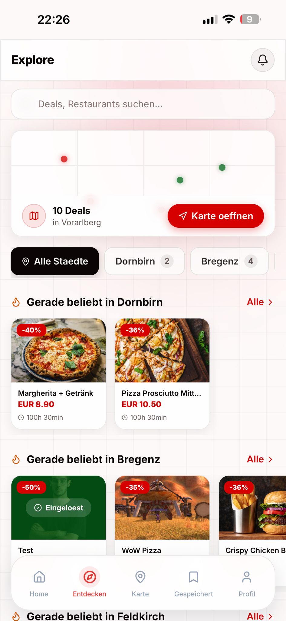 Entdecke Deals in Dornbirn, Bregenz, Feldkirch und Bludenz direkt auf der Karte.